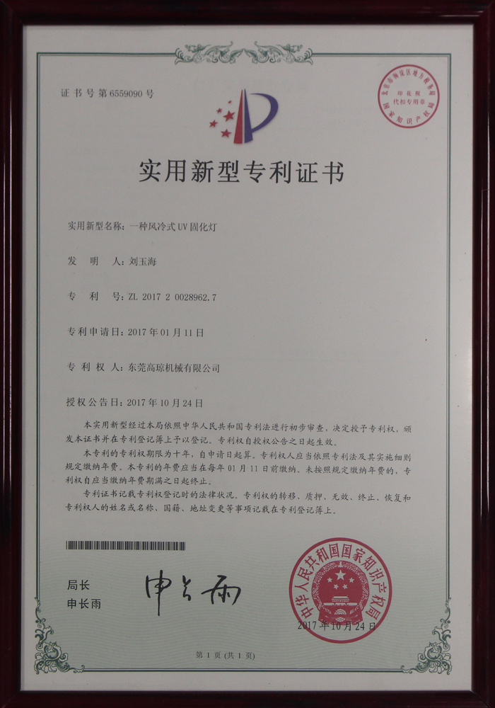 風(fēng)冷式UV固化燈專利證書